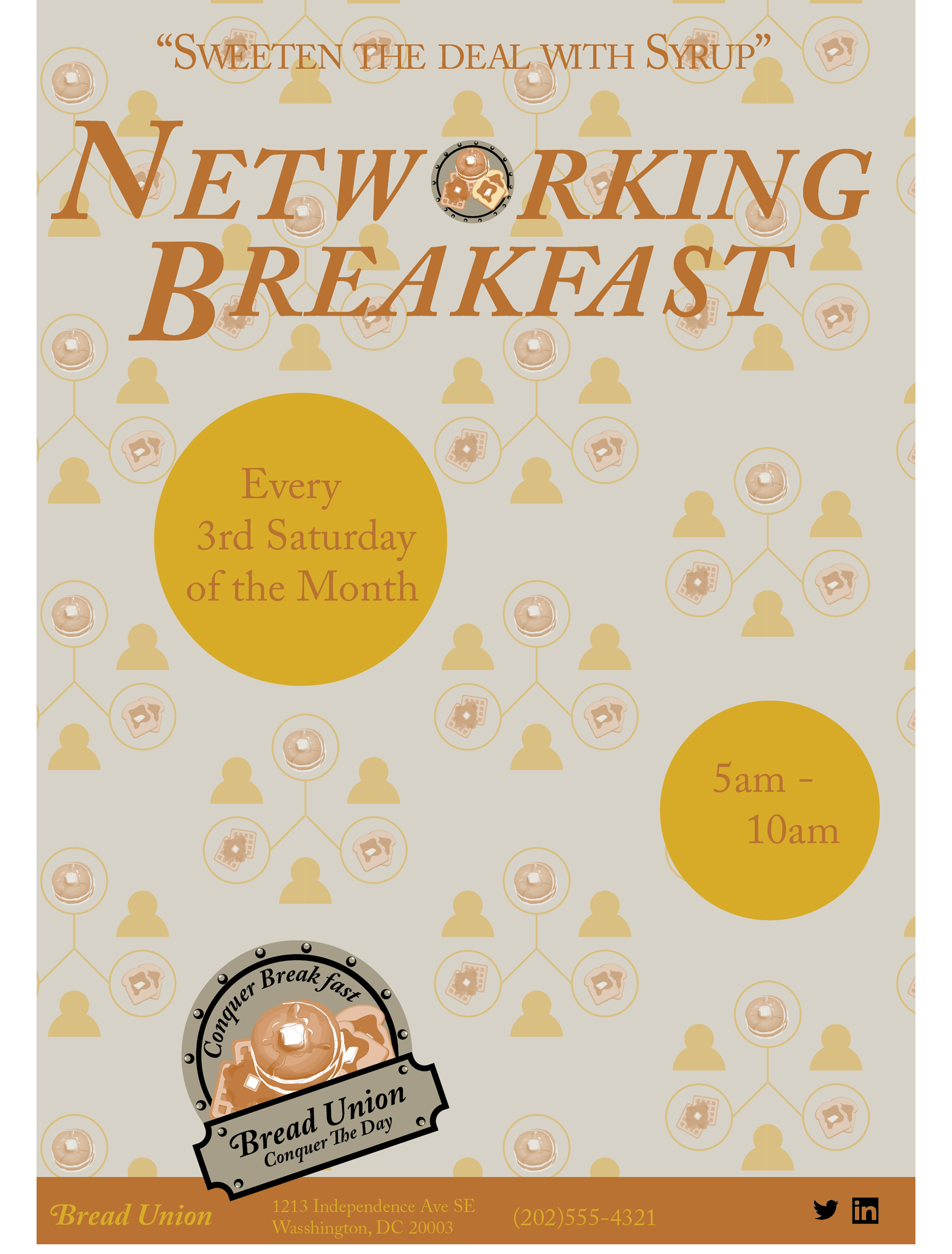 Flyer announcing an early morning networking event. Fun Fact: Bread Union was selected from a list of workshop names.